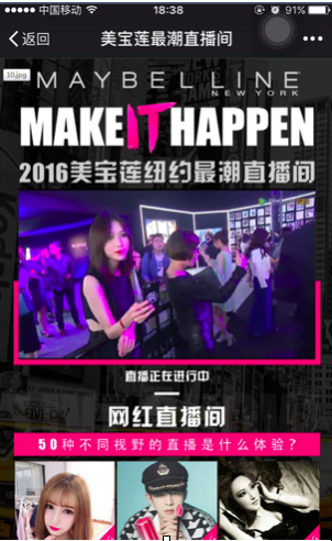 比如前不久,美寶蓮在紐約舉辦的現(xiàn)場發(fā)布會號稱“美妝×高科技的超強跨界”,這其實是美寶蓮為自己新推出的產(chǎn)品“好色”而做的一次宣傳活動,除了代言明星angelababy到場以外,主辦方同時主動邀請了50名網(wǎng)紅進行現(xiàn)場的直播,包括像dodolook、honeyCC這樣的美拍美妝網(wǎng)紅都應邀來到現(xiàn)場進行直播。