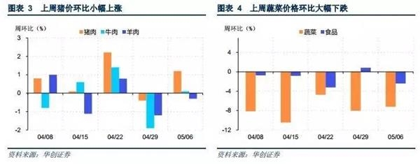 上周農(nóng)產(chǎn)品價格總體上延續(xù)下跌走勢,豬肉價格小幅上漲,蔬菜價格大幅下跌。上周五,農(nóng)產(chǎn)品批發(fā)價格總指數(shù)收于205.87,環(huán)比下跌1.64%;菜籃子產(chǎn)品批發(fā)價格指數(shù)收于208.04,環(huán)比下跌1.91%。從細項數(shù)據(jù)看,22個省市平均豬價環(huán)比上漲0.8%;牛肉下跌0.8%;羊肉上漲1.0%(圖表3)。上周蔬菜價格環(huán)比下跌8.14%,水果價格環(huán)比下跌0.72%(圖表4)。國內(nèi)5月生豬供應(yīng)缺口較大,屠宰企業(yè)存在一定采購壓力,壓價情緒較高,雖然部分省市儲備肉陸續(xù)投放,平抑市場肉價,但短期供應(yīng)緊缺格局難改,國內(nèi)豬價可能小幅上揚。隨著氣溫回暖,蔬菜供給增加,價格還有下降空間。