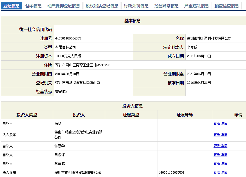 資料顯示,深圳神州通付在2011年6月成立, 2012年6月獲批支付牌照,業(yè)務范圍為全國范圍內(nèi)開展互聯(lián)網(wǎng)支付和移動電話支付,目前注冊資本為1億元。申請牌照時候的唯一股東是深圳年年卡公司。公開資料顯示,深圳市年年卡網(wǎng)絡科技有限公司成立于2006年6月,2016年1月7日于香港上市。年年卡在手機話費充值領(lǐng)域擁有超過1億用戶,高峰期單日交易量100萬筆,據(jù)稱于在線話費充值市場占有率位居第一名。