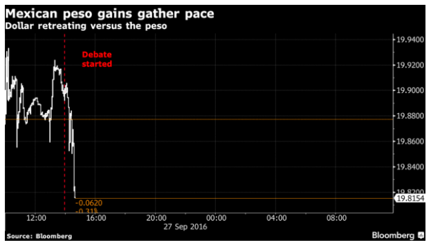 辯論期間,被認(rèn)為辯論表現(xiàn)指標(biāo)的墨西哥比索匯率,有所上漲,期間漲幅一度達(dá)到1.4%,這表明市場人士認(rèn)為希拉里暫時處于領(lǐng)先趨勢。