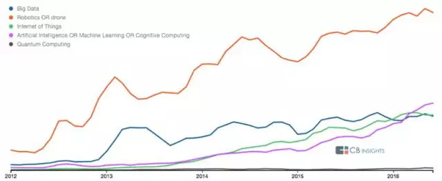 關于機器人學及人工智能相關領域的研究趨勢(由 CBInsights Trends tool 制作)